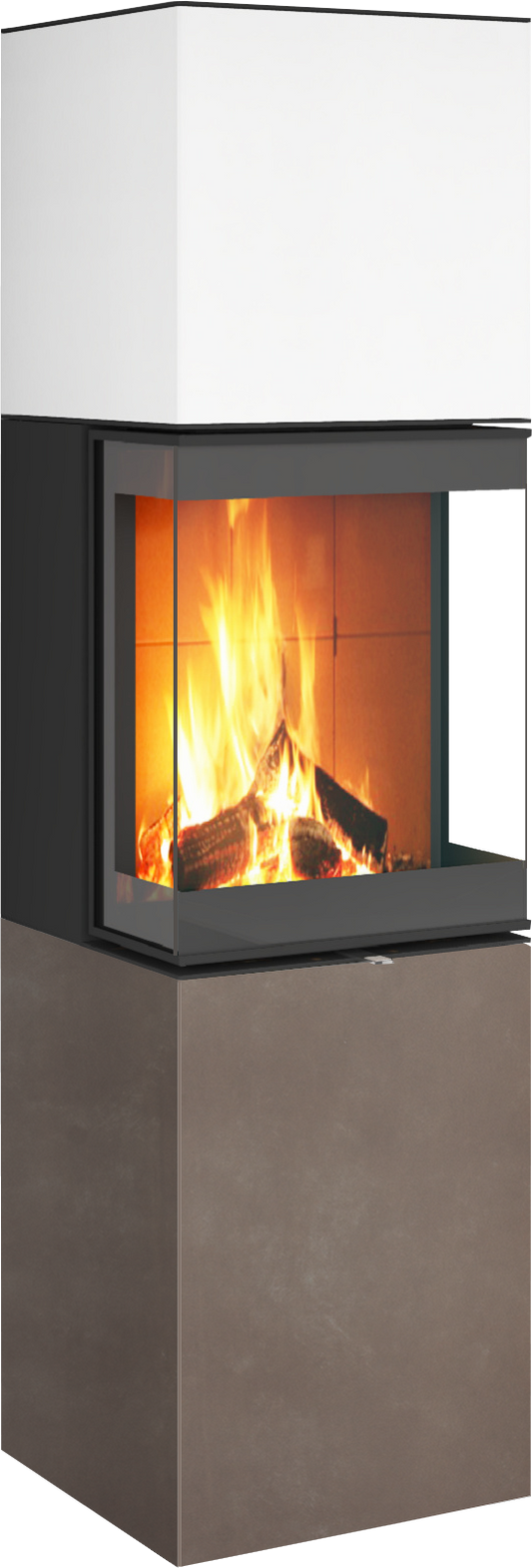 Die CF Box ist ein vielseitiges modulares Unterbau-Element, das mit verschiedenen freistehenden Kaminen kombiniert werden kann.